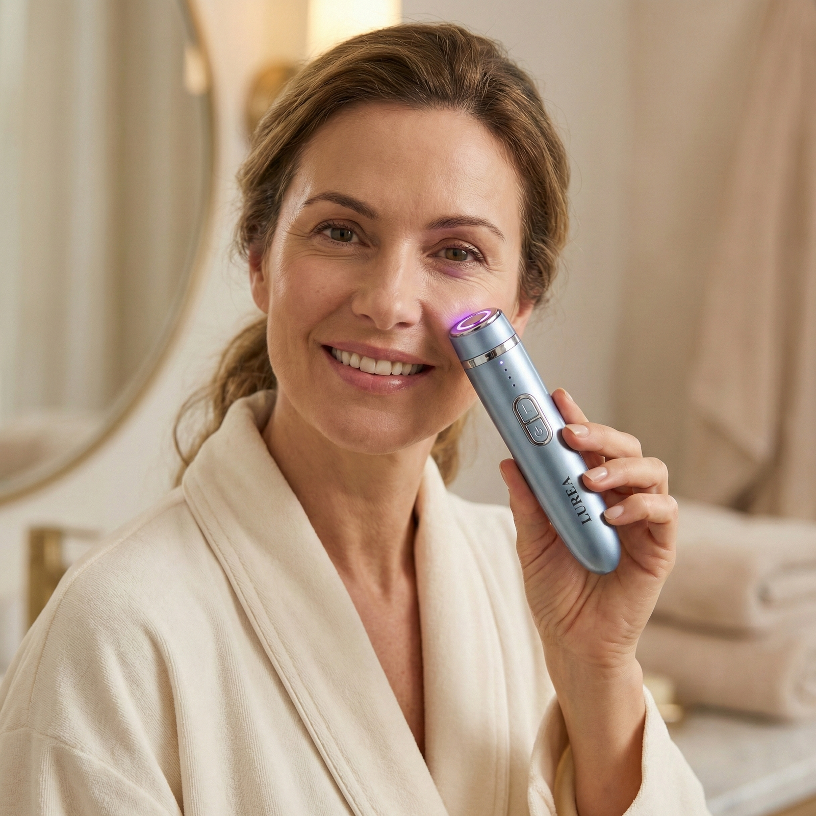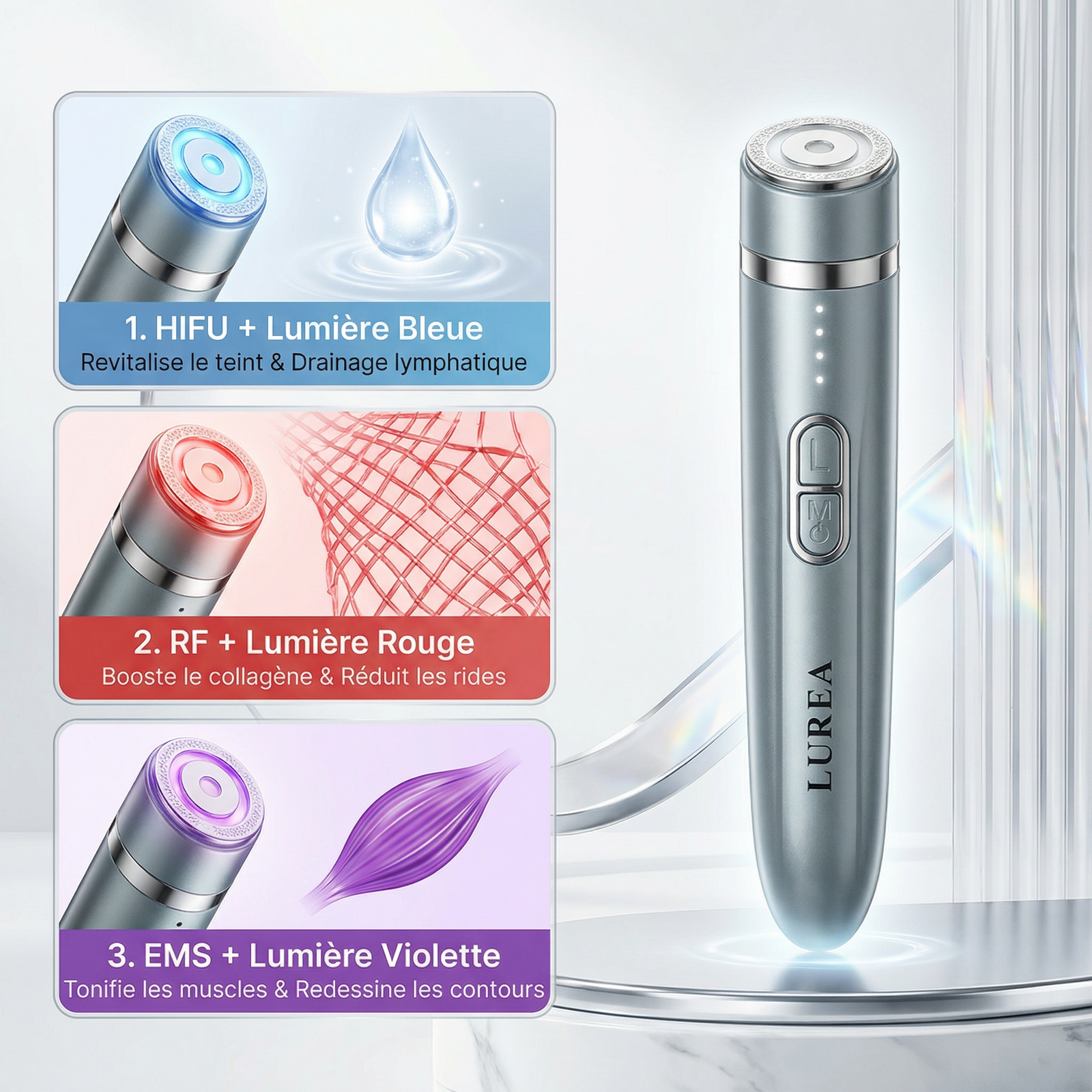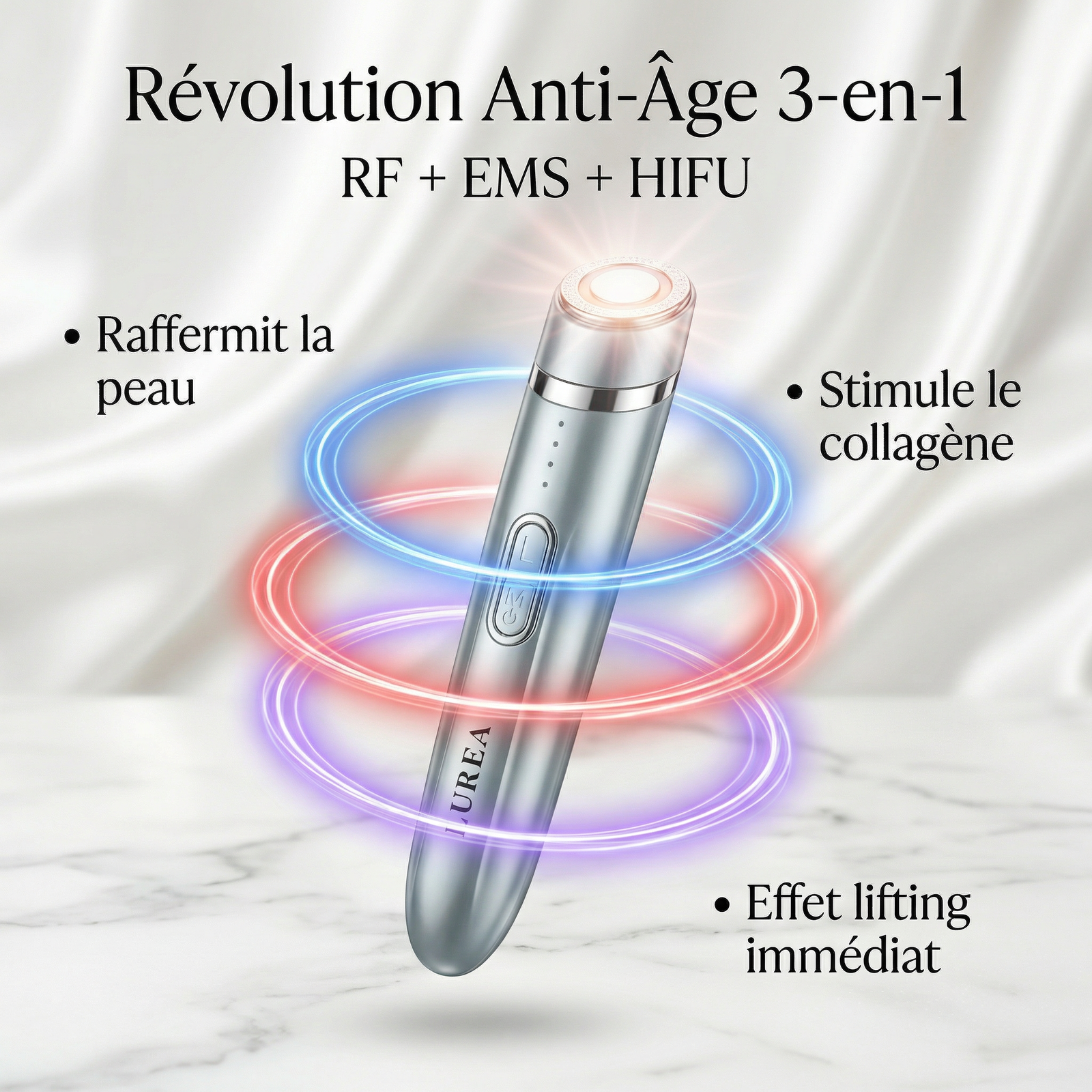 Booster Anti-âge Lurea 3 en 1 : RF, EMS, HIFU. Réduit rides, raffermit la peau, stimule le collagène et illumine le teint pour un visage jeune.